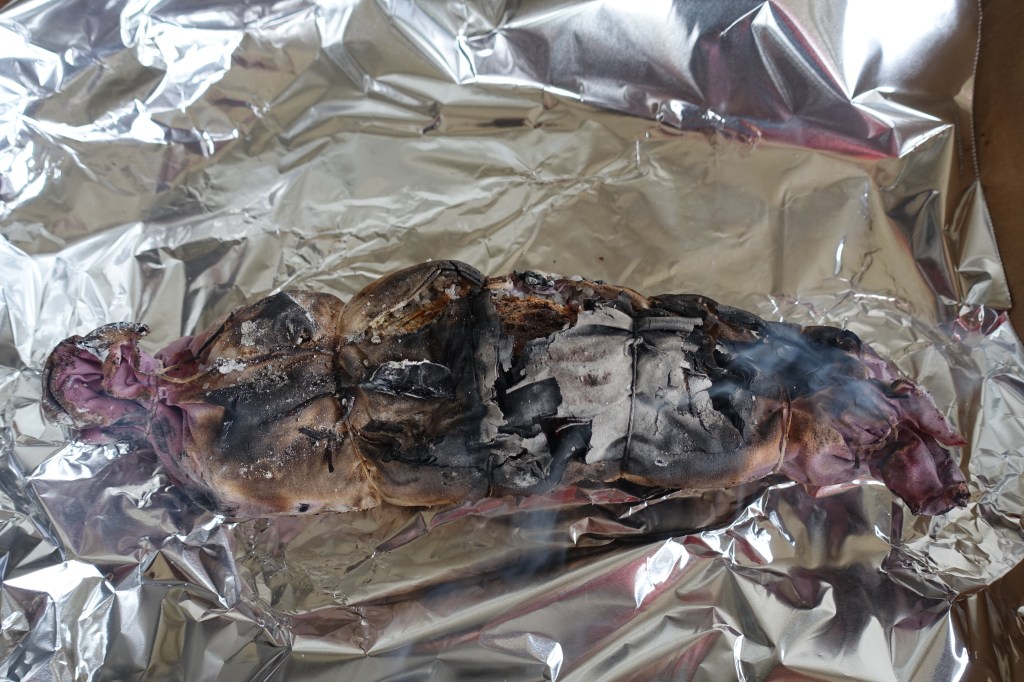 Preparate le braci ardenti (con legna o carbonella),viene adagiato sopra il filetto. Personalmente piace ottenere una fetta di filetto rosata all’interno e raggiungo questo risultato lasciando sopra le braci 7 minuti per lato. Sostanzialmente in un quarto d’ora la cottura è pronta. Rimosso dalle braci apriamo questo fagotto carbonizzato e con l’uso delle pinze rimuoviamo il filetto ,pulendo il sale per bene (sennò risulta eccessivamente sapido) con un canovaccio pulito.