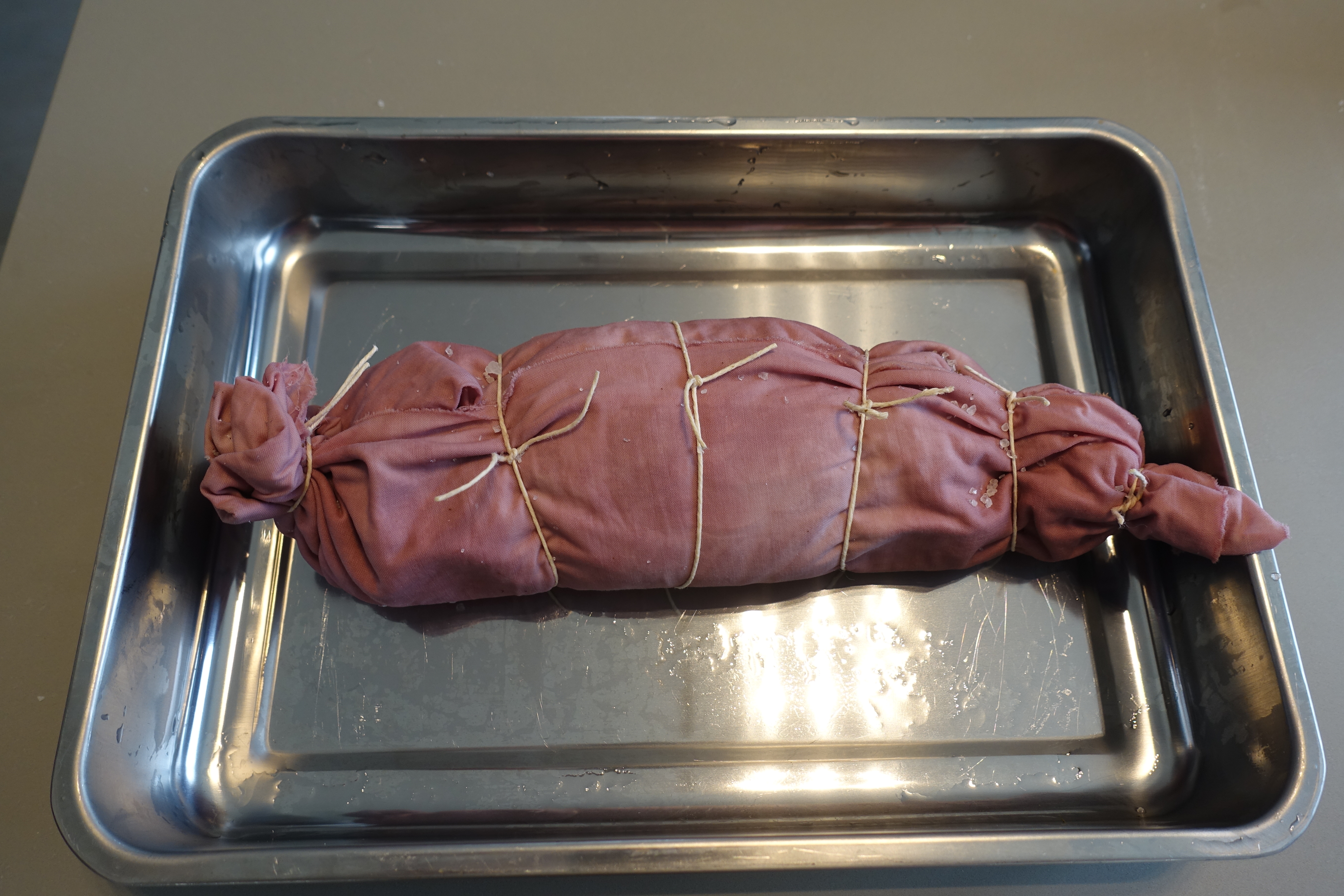 Imbevuto il “trapo” col vino lo si dipone su una superficie creando al di sopra uno strato di sale. Preferisco usare quello grosso perché risulta più facile da rimuovere successivamente.Prima di adagiare sopra il filetto aggiungiamo delle spezie a nostro piacimento. In questo caso un mix aromatico mediterraneo con origano, rosmarino, timo, aglio, coriandolo, maggiorana e ginepro. Il tutto viene avvolto sul filetto e legato saldamente con spago da cucina.