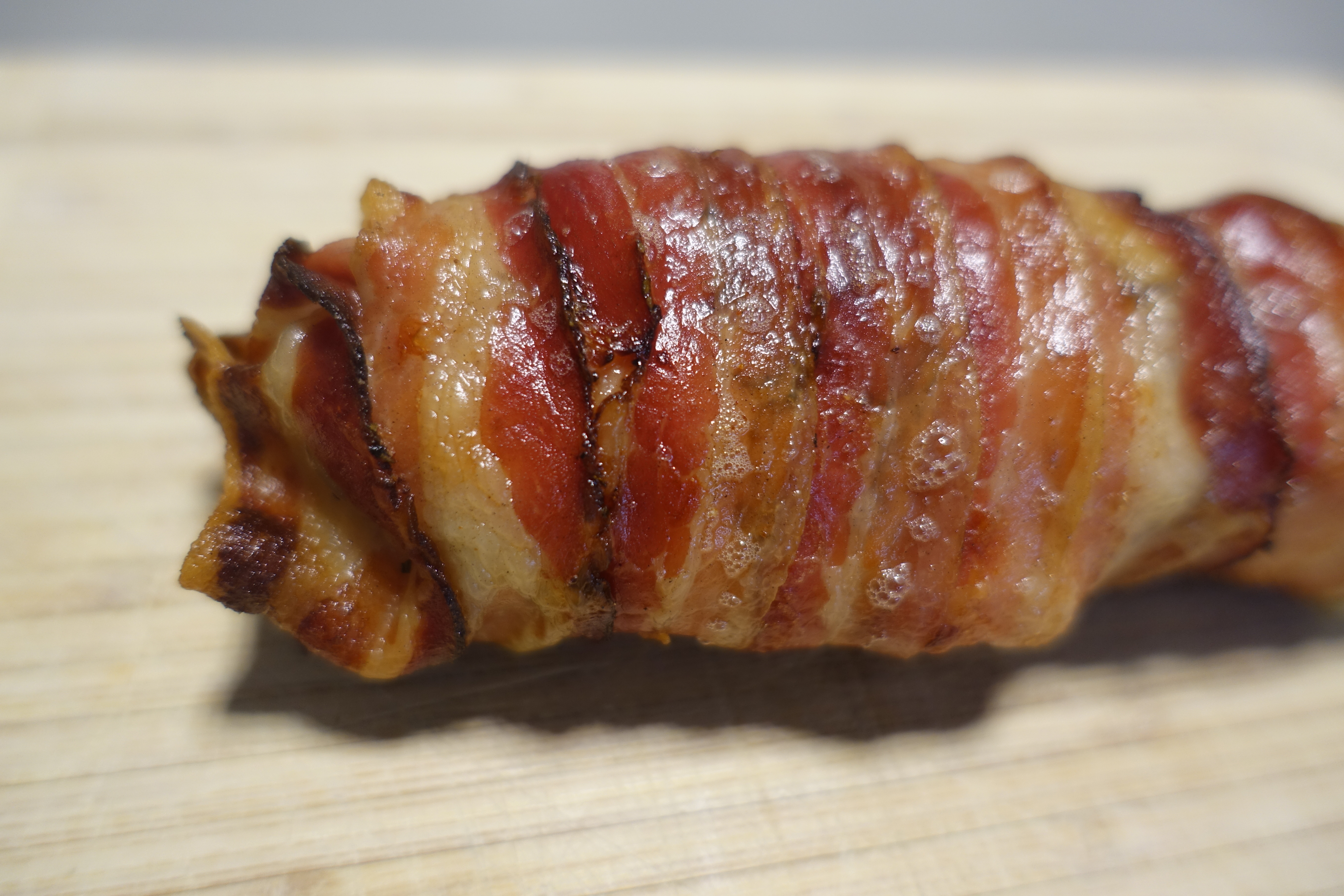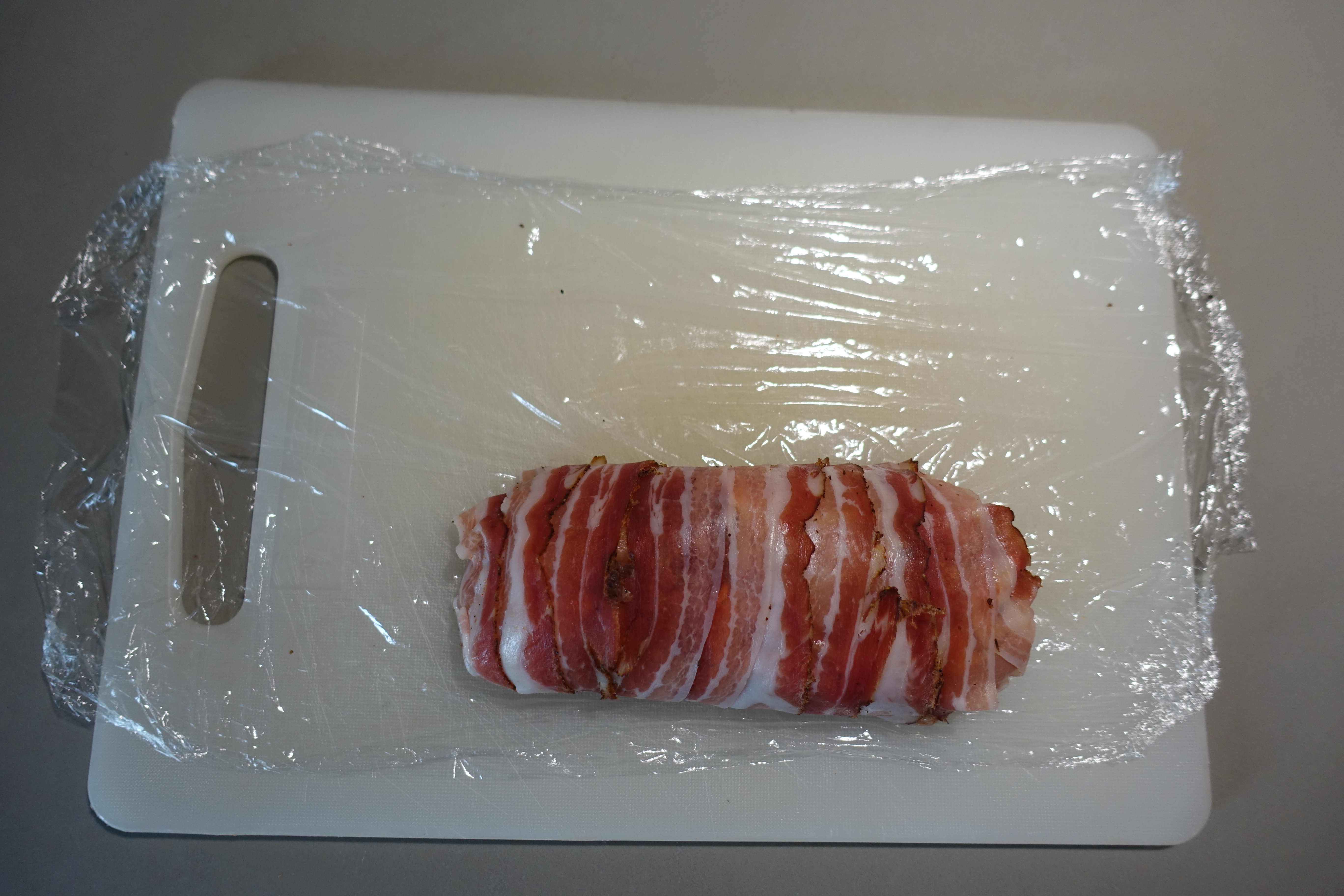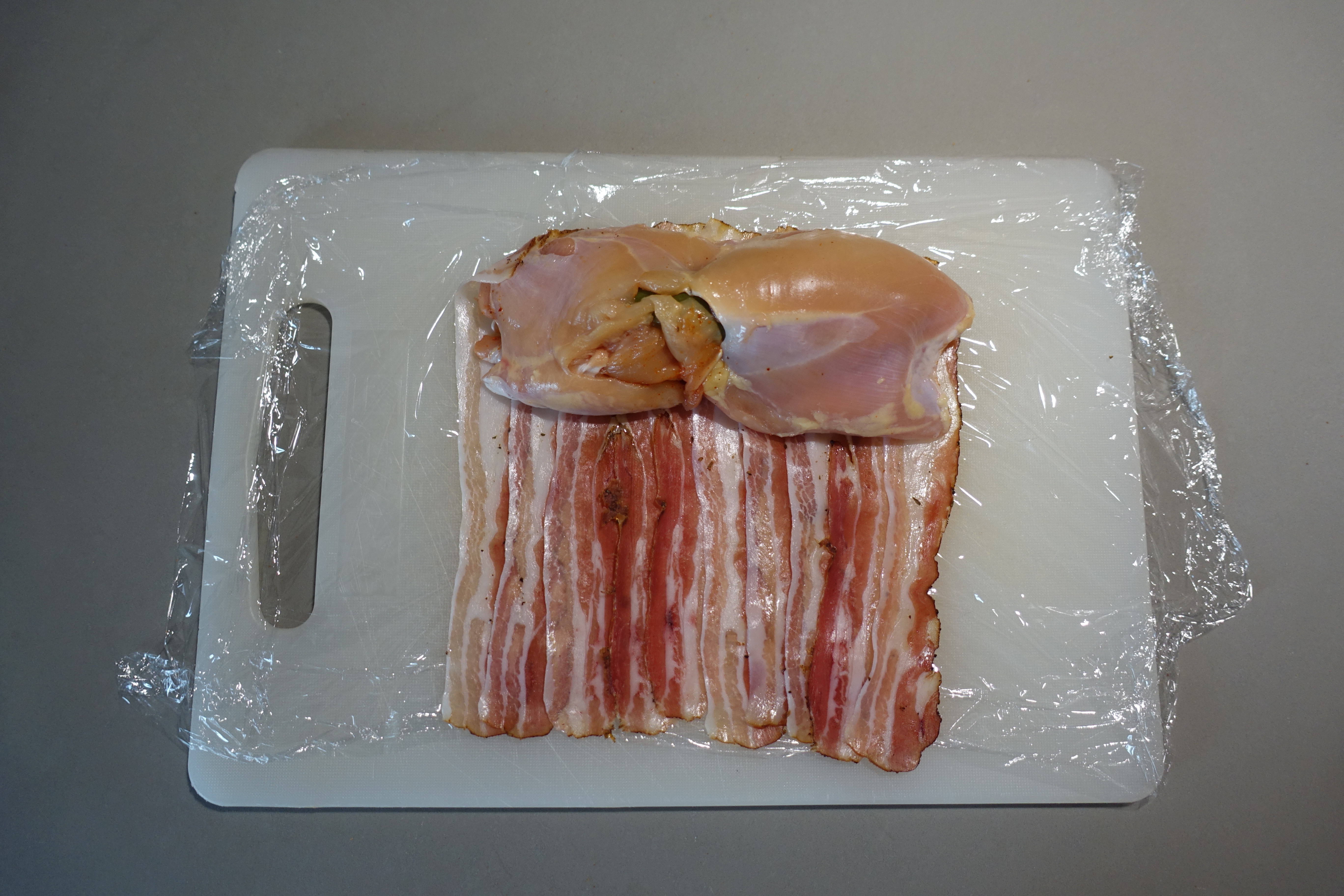 Su un tagliere disponiamo la pellicola da cucina e su di essa formeremo in modo semplice un tappeto di bacon ( o pancetta affumicata) affiancando e sovrapponendo di poco tra loro le fette. Dopo averci adattato sopra il pollo con al centro il peperone farcito di formaggio, ci aiutiamo con la pellicola e arrotoliamo il tutto. IL piccolo arrosto così creato lo riponiamo in frigo in modo tale che si compatti e mantenga la forma nelle prime fasi di cottura.