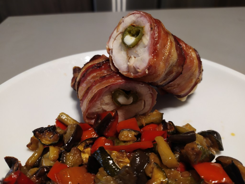Siamo così pronti per la fase finale ovvero la cottura nel dispositivo che più ci piace :nel mio caso il bbq ( così posso dargli anche affumicare leggermente con il ciliegio ),ma anche il forno va bene. Settiamo a 200 gradi circa e in 40 minuti circa saremo pronti. Come sempre mi faccio guidare dall’aspetto ma soprattutto da un termometro a lettura veloce. La carne di pollo ,per sicurezza sanitaria, deve raggiungere almeno i 75 gradi di conseguenza aspettare gli 80 gradi mi sembra ragionevole.
