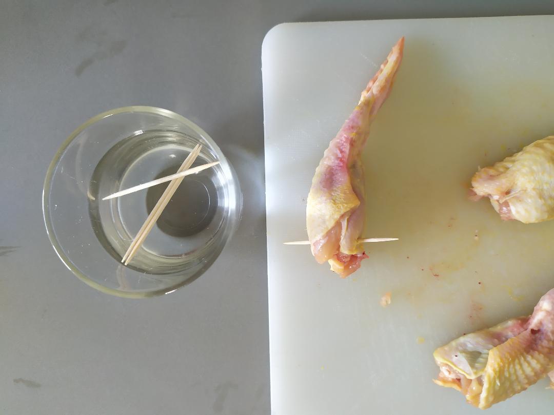 Nel frattempo mettiamo in un bicchiere d’acqua dei stuzzicadenti, questo farà in modo che non brucino alle temperature di cottura delle alette. Mantenuta la loro integrità si sfileranno facilmente prima presentarle nel piatto e avranno mantenuto la farcia in posizione e sopratutto chiudendo l’apertura delle alette manterranno al loro interno il formaggio fuso.