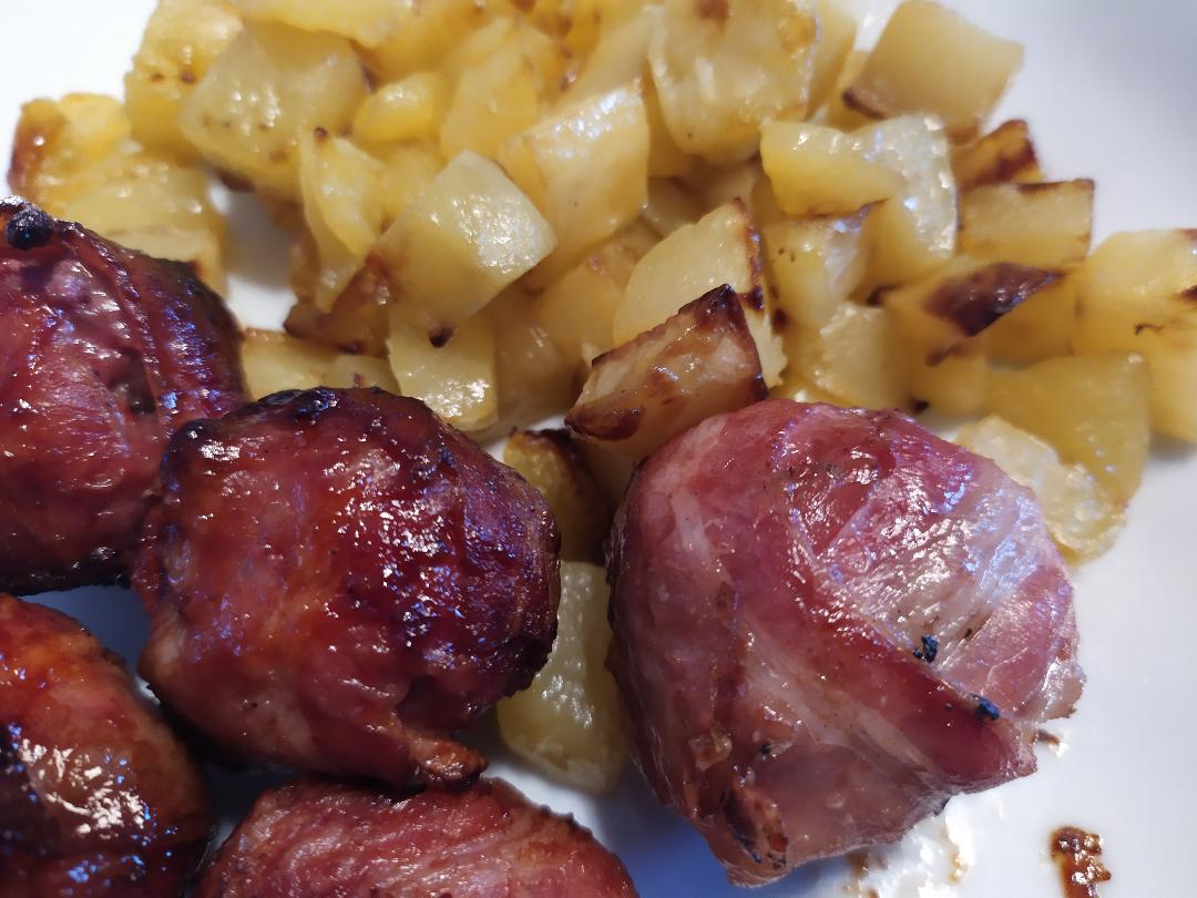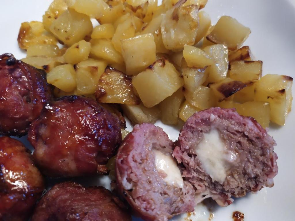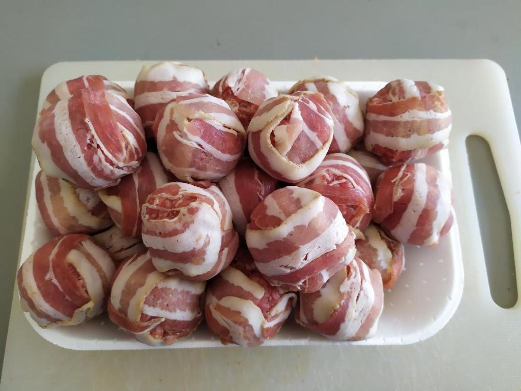Le palline formate andranno successivamente rivestite con i bacon utilizzando due strisce che cercheremo di intrecciare ricoprendo tutta superficie.