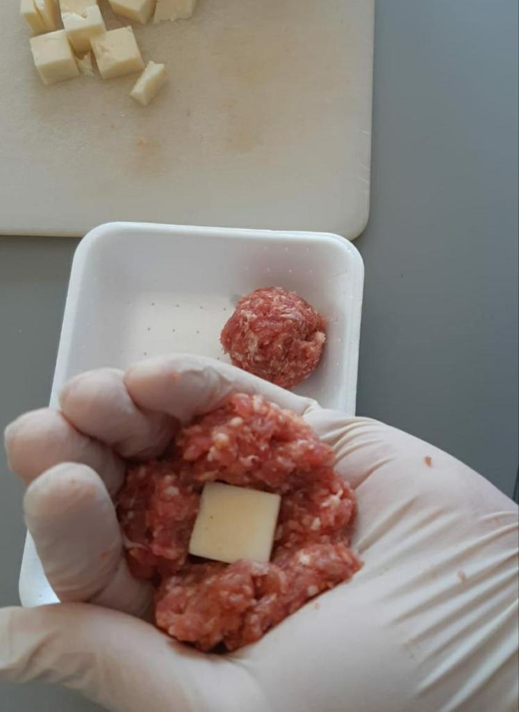 Dopo aver tagliato a cubetti il formaggio prendiamo una piccola porzione d’impasto e ci aiutiamo con l’incavo della mano ponendo nel mezzo il formaggio. Andremo così a formare una pallina di carne .